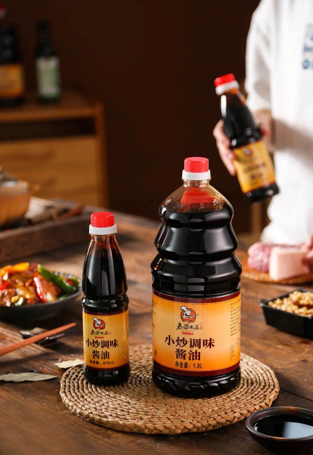 小炒酱油与蔬百鲜蒸炒汁是老谭味道的产品“双子星”。小炒酱油,被厨师们称呼为小炒大王,色泽红亮,豉香浓郁,滴滴入魂,为湘菜的小炒系列增添了不可言喻的风味。